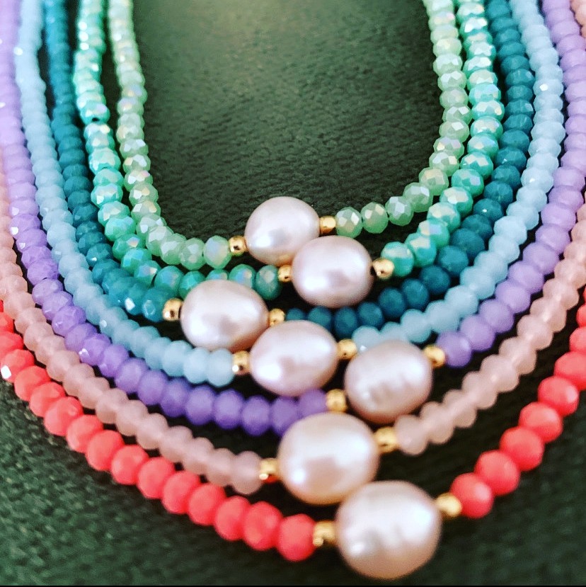 Colar confeccionado em cristal tamanho 2, cores conforme foto, 38cm + corrente extensora, pérola de água doce central. Todos os elementos de metal banhados em ouro champagne 18 quilates com base antialérgica paládio.