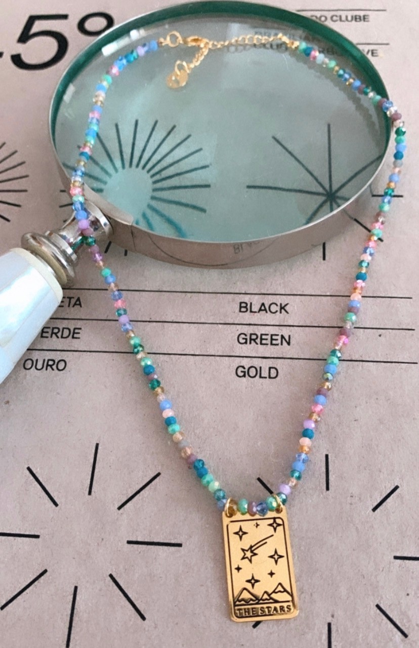 Colar confeccionado em cristal tamanho 2, mix de cores conforme foto, 40 cm + corrente extensora, placa carta do tarô "a Estrela". Todos os elementos de metal banhados em ouro champagne 18 quilates com base antialérgica paládio.